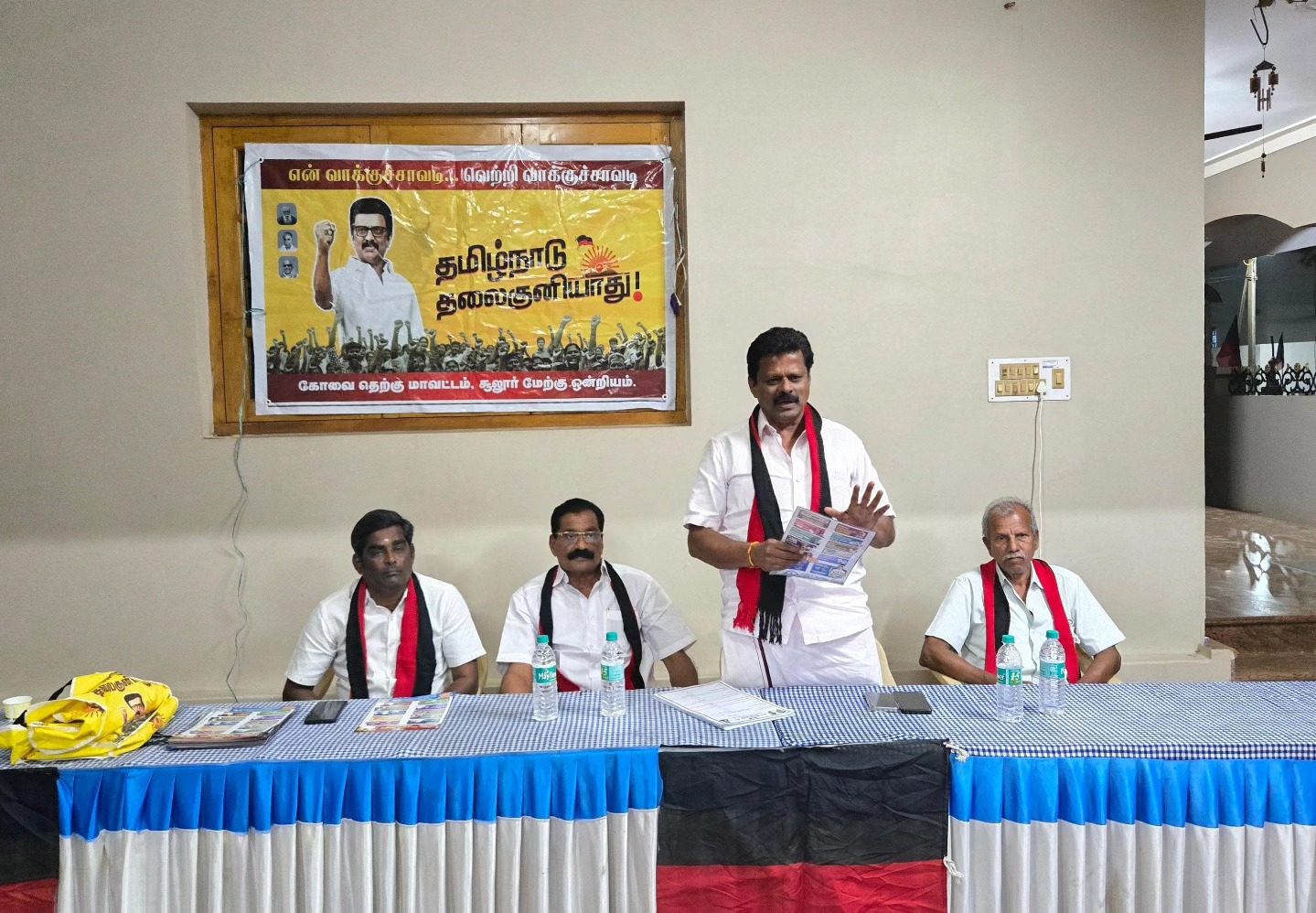 சட்டசபை தேர்தலை அடுத்த ஆண்டு நடைபெற இருக்கும் நிலையில் ஆளும் கட்சியான திமுக என் வாக்குச்சாவடி வெற்றி வாக்குச்சாவடி என்ற பிரச்சாரத்தை முன்னிறுத்தி மாவட்டம் முழுவதும் நடத்திவருகிறது . கடந்த 10ஆம் தேதி முதல் நடைபெற்றுவரும் இந்த நிகழ்வு 20ஆம் தேதி கோவை தெற்கு மாவட்டத்திற்குட்பட்ட சூலூர் சட்டமன்ற தொகுதி சூலூர் மேற்கு ஒன்றியம் குளத்தூர் ஊராட்சி 98,99 ஆகிய பாகங்களில் நடைபெற்ற பரப்புரை கூட்டம் நடைபெற்றது இதில் திமுக கோவை தெற்கு மாவட்ட கழக செயலாளர் தளபதி முருகேசன் அவர்கள் கலந்து கொண்டு ஆலோசனைகளை வழங்கி சிறப்புரையாற்றினார். இந்நிகழ்வில் சூலூர் மேற்கு ஒன்றிய செயலாளர் அன்பரசு, மாவட்ட மகளிர் அணி அமைப்பாளர் ஜெயலலிதா, மாவட்ட அயலக அணி துணை அமைப்பாளர் வைஸ் கந்தசாமி, ஒன்றிய இளைஞரணி நவீன், தனபால், பிரவீன், கிளைச் செயலாளர் சண்முகம், கருப்புசாமி, முருகேஷ்,BLA2 துரை (எ) சதாசிவம், மனோஜ், பாக நிலை முகவர்கள், பூத் கமிட்டி உறுப்பினர்கள், பூத் டிஜிட்டல் ஏஜென்ட்கள், சார்பு அணி அமைப்பாளர்கள், துணை அமைப்பாளர்கள் மற்றும் கழக நிர்வாகிகள் கலந்து கொண்டு சிறப்பித்தனர்.