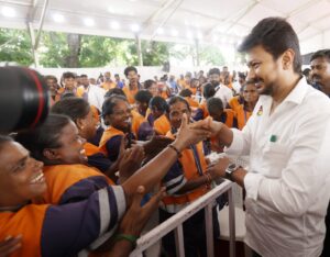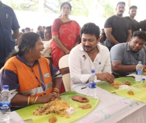 தூய்மைப் பணியாளர்களுடன் அமர்ந்து உணவு சாப்பிட்ட உதயநிதி ஸ்டாலின்!
